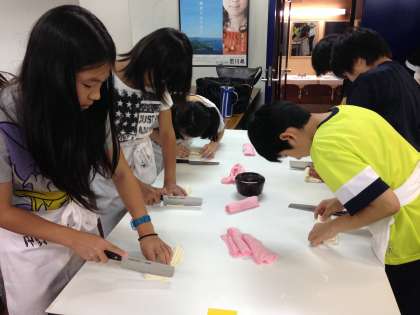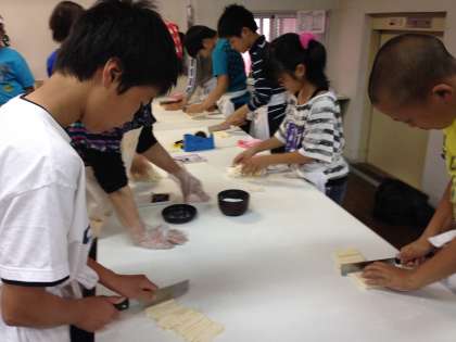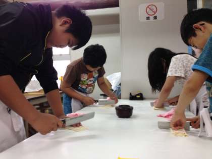 びょうぶだたみにしました。包丁で切ります。五ミリくらいの幅です。粉をまぶします。