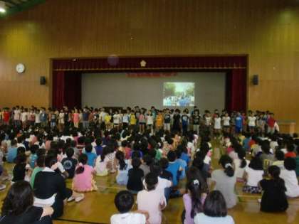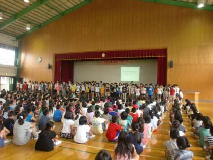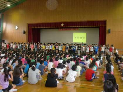 ふかくさタイム6年生の発表がありました。修学旅行で行った広島についての発表です。全校児童の前で『平和宣言』をした後,各クラスから『戦争』『平和』について考えたことを発表しました。平和の大切さを全校のみんなで確認し合いました。