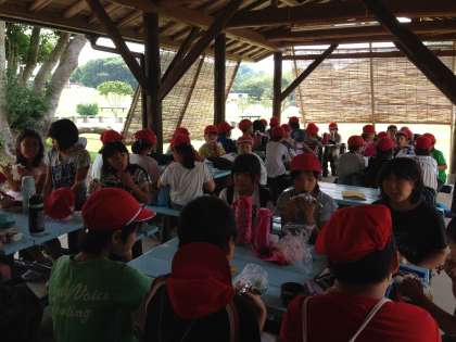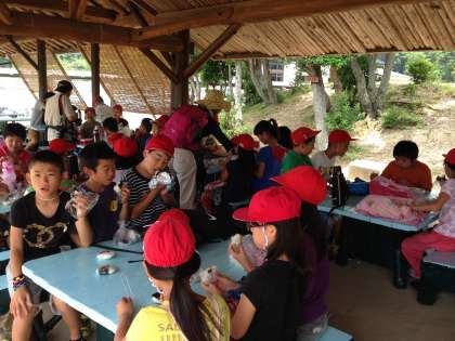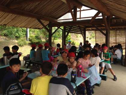 東屋でおにぎりを食べています。
