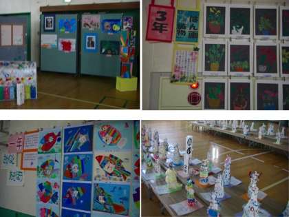 23日〜25日まで,開かれていた作品展。どの学年も,一生懸命作ったのがわかる力作ぞろいでした。各学年の成長段階にあわせての作品。