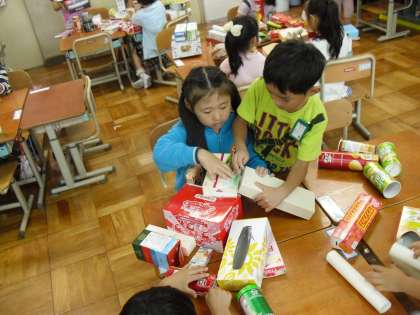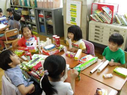積みやすい形,転がりやすい形など形の特徴を生かして作品を作りました。