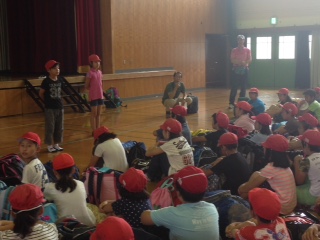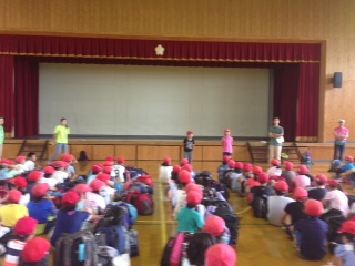 待ちに待ったみさきの家に出発する日が来ました。あいにくの天気で出発式は体育館で行いましたが,みんな元気いっぱいです。