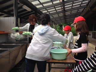 食器係は食器を洗い,調理器具は熱湯消毒です。