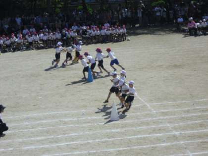 3年生の団体競技です。うまくスピードを合わせて回転します。