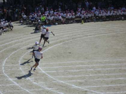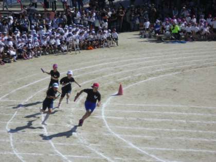 運動会の最後の得点種目のリレーです。5年生と6年生の代表が力いっぱい走りました。