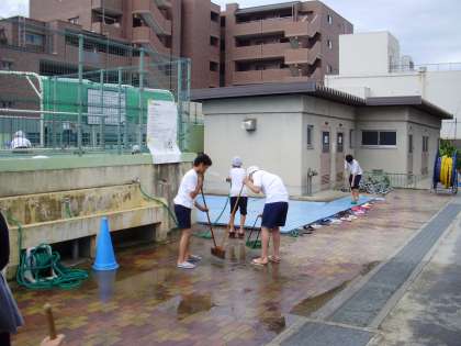 来週から始まるプール学習に向けて6年生のみんながプール清掃をしました。3時間目から,3組,4組,1組,2組の順にそうじをしました。写真は最後の組のそうじの様子で仕上げの段階です。決して遊んでいるわけではありません。まあ,少し水のかけ合いっこはしましたが……でも,すっかりきれいになりましたよ。
