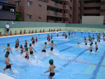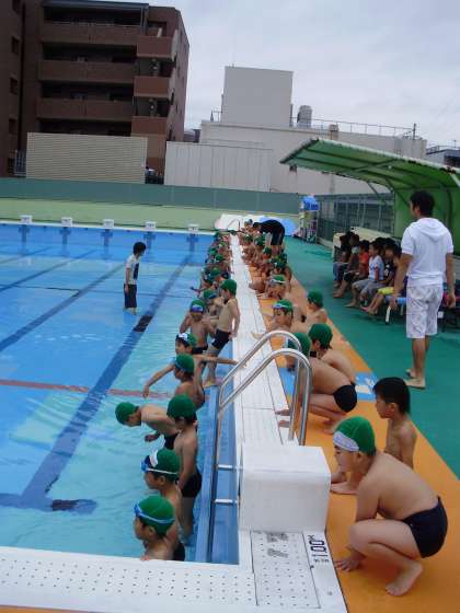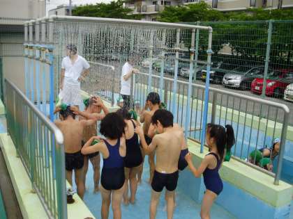水泳学習が今日からはじまりました。スタートは2年生です。まだ水は少ししかはいっていませんがワクワクどぎときします。シャワーの水をあびるとさすがに冷たい! プールに足をつけてみるとひんやり! でも,しばらくするとそんな冷たさも忘れ,元気いっぱいに久しぶりのプールを楽しみました。明日は幼稚園の人たちとのプール交流があります。天気が少し心配です。