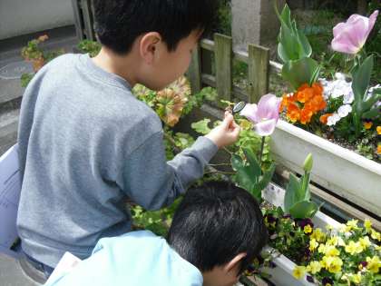 今日は3年生になって初めての理科の学習がありました。観察するときの秘密兵器「虫眼鏡」を使って,楽しんで生き物の観察をしていました。これからの理科の学習がとっても楽しみですね。