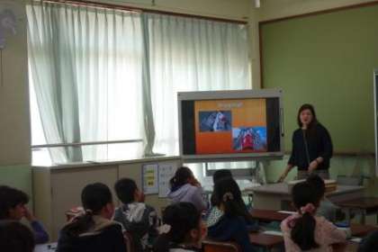 今日は、初めての外国語活動で、ALTの先生に来ていただきました。アメリカの文化や生活の様子を写真や映像を通して紹介していただきました。初めての英語にドキドキのみんなでしたが、楽しく活動できました。