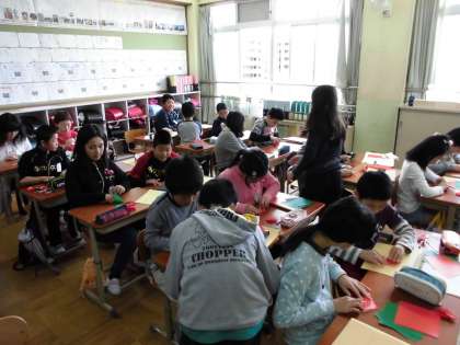 6年生は修学旅行で北淡震災記念館に行く予定です。その際,慰霊碑に捧げる千羽鶴を折っています。気持ちを込めて丁寧に折っています。