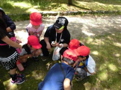 雨で延期になっていた生活科のはるみつけに行きました。初夏の陽気のなか、子どもたちはたくさんの春を見つけていました。シロツメグサ、たんぽぽ、てんとう虫やダンゴ虫など、「きれいなお花をみつけたよ!」「これなにかな〜?」とたくさんの発見があったようです。