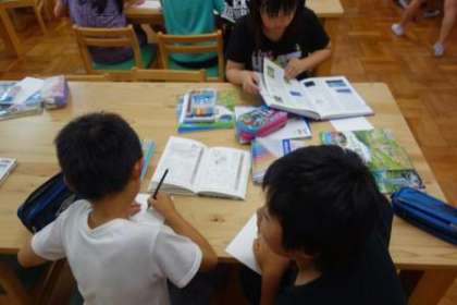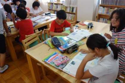 日本の国土の特色の学習をしています。今日は、第2図書室で調べ学習を行いました。梅雨・季節風・台風について調べ、班でまとめました。