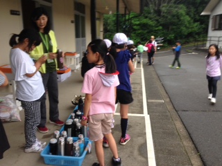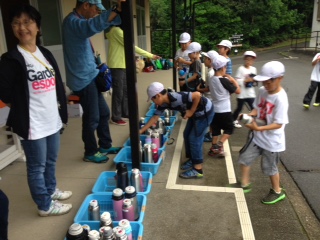 中を洗って、水筒に、お茶を入れてもらいます。中々、全員揃いません。つぎは、早くできるかな。