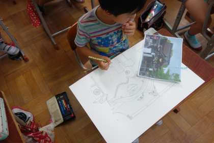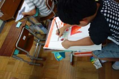 お気に入りの地域の場所を選び、絵をかいています。下書きが終わり、色ぬりを始めている子もいました。