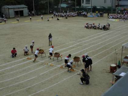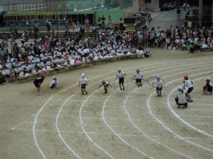 3年生の障害物競走です。マットやハードル,わっか,ボールを箱に入れて走り抜けます。