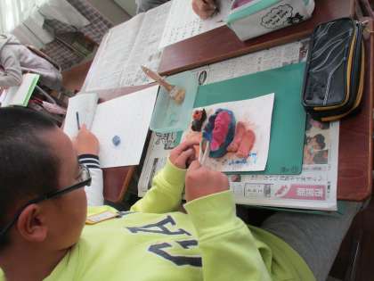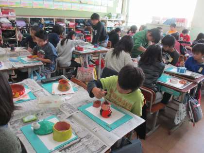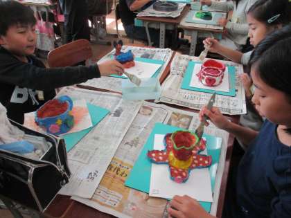 「使って楽しい焼き物」では、テラコッタ粘土で作品を作っています。色ぬりをした後に、ニスを塗りました。