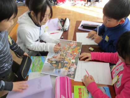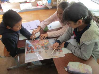 外国の「ある一家族」の一週間の食料の写真を使って、家族が住んでいる国がどこかをグループごとに考えました。初めて見る食材や、家族の様子に「なにこれー!」「バナナがいっぱい!」「みんな帽子をかぶっているよ」「お肉が多すぎる!」「フランスパン毎日食べてはるんかな〜?」とたくさんの気付きを友だちに伝え合うことができました。また、地図帳や本なども使って、住んでいる国を一生懸命考えていました。