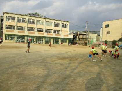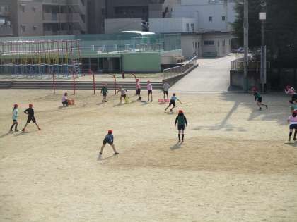 ベースボールの学習をしています。チームごとに作戦を立てたり、声を掛け合ったり、しています。「こっちに投げて!」「ナイス!」一人一人自分の役割を頑張っています。
