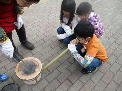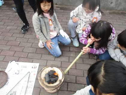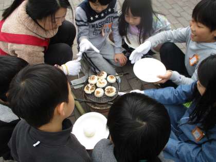 社会科の昔の道具を使う学習で,今日は1・2組が七輪を使っておもちを焼きました。「昔の人はこんなに長い時間をかけてやっとおもちを食べられたんやなあ。」「でも自分たちで火をおこして焼いたおもちはおいしいな。」という感想がありました。