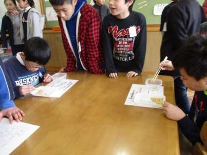 15日(水)の中間休みに,ランチルームで給食委員会による「豆つまみ大会」がありました。30秒間に豆をいくつおはしで移動させることができるでしょう。結果が楽しみです。
