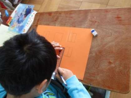 カッターナイフを使って窓を切り抜き,建物をつくっています。