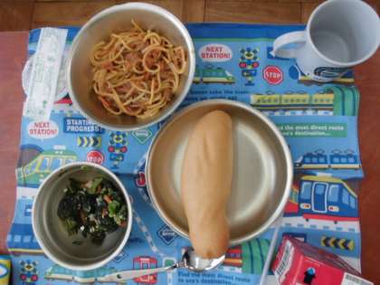 1年生にとって初めての給食はスパゲッティでした。みんなから「おいしい〜」の声が聞かれました。給食の配膳には6年生のお兄さんお姉さんが手伝いに来てくれました。