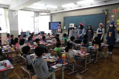 また給食当番もどんなことをするのかわくわくしながら,一生懸命取り組んでいました。6年生のお兄さん,お姉さんも,1年生のために給食の準備や片づけなどを手伝ってくれています。これからも毎日,楽しく給食を食べてほしいと思います。