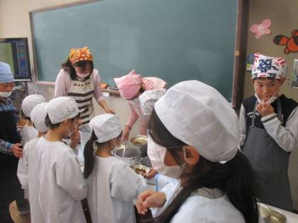 給食のお手伝いにいってきました。かわいい1年生に分かりやすく、ていねいに声をかけてくれていました。頼れるお兄さん、お姉さんです。いつもありがとう。