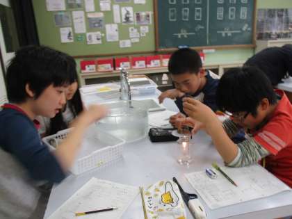 物の燃え方の学習をしています。今日は、窒素・酸素・二酸化炭素を使って、ろうそくの燃え方の実験を行いました。酸素に入れたとき、「わーすごい」「明るくなった」と感動の声が上がっていました。
