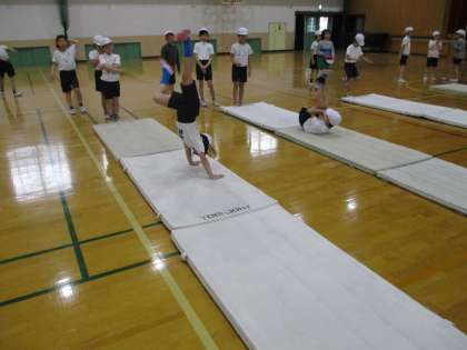 新しく学習した「ロンダート」の練習に挑戦する人,まだできない「後転」に挑戦する人,一人一人がめあてをもって頑張っています!