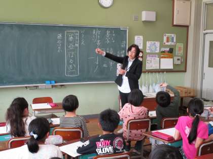 書写は北田先生と一緒に学習をしていきます。今日は,名前のきれいな書き方や,言葉のまとまりで書くことを教えていただきました。いつも意識して丁寧な字が書けるといいですね。