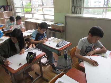 図工では身近な風景を描いています。遠近法を使ってスケッチしました。後少しでスケッチが出来上がりそうな子もいます。