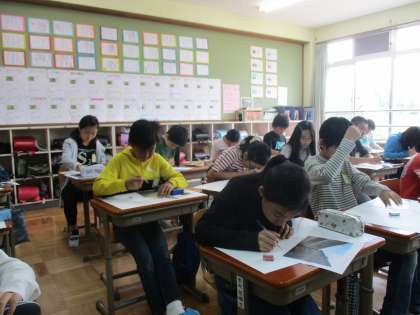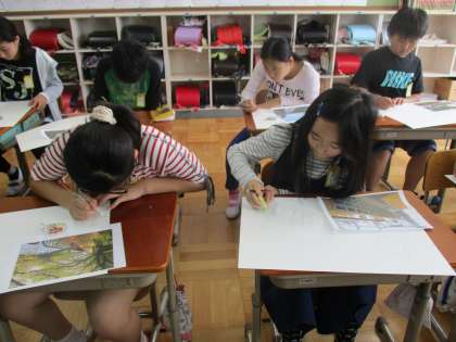 スケッチをしているときは、みんなとっても集中しています。シーンと静まり返った教室で一人一人頑張っていました。最後の方は、お互いのスケッチを見合い、「ここいいな」「こうしたらいいんか」と友だちのいいところを見つけられていました。