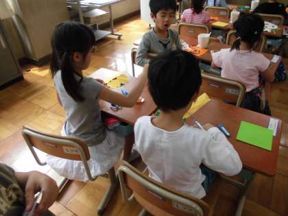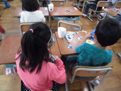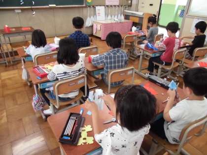 図工の時間に,チョキチョキかざりをしました。折り紙を三角や四角に折ったり,それをギザギザや丸の形に切ったりして,色んな飾りを作っていました。折り紙を丸く切って,りんごの皮のような形も作っていました。子供たちはとても楽しそうで,自分だけの素敵な飾りがたくさん出来上がりました。