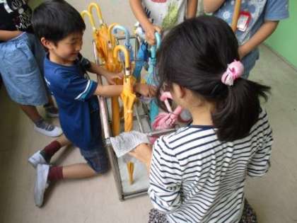 掃除時間に隅々まできれいに掃除しています。傘立ての裏側までピカピカにしていました。