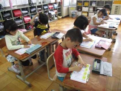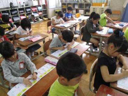 新出漢字の練習をしています。とめ・はね・はらいに気を付けて書いています。また,書く時の姿勢や書く速さを意識し,丁寧に書いています。