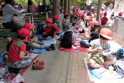 「早くお弁当食べたいな〜」「ぼくのお弁当にデザート入ってるねん!」と,とても嬉しそうな様子。ハトにおかずを狙われていたので,お弁当を守りながら,みんなで楽しく,おいしく食べることができました。朝早くから,ご用意していただきありがとうございました。