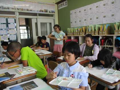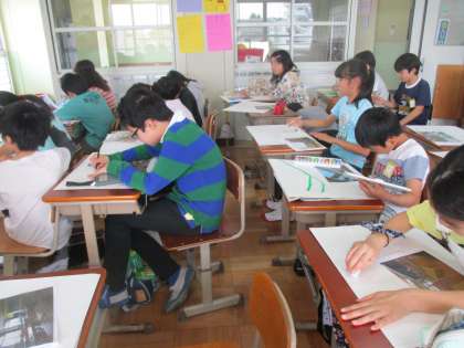 「身近な風景」の色ぬりを始めています。水の使い方、絵の具の濃淡に気を付けて取り組んでいます。