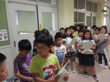 今日は学校探検に向けて,1年生に案内するコース順を確認しました。途中で部屋の説明の練習もしました。