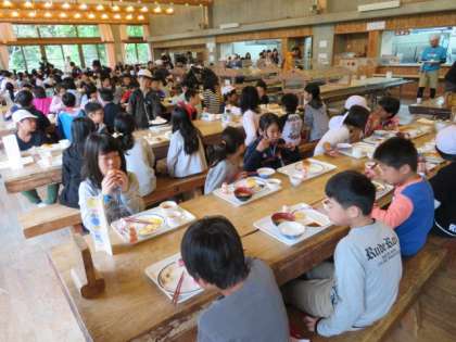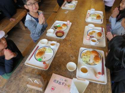 「いただきま〜〜〜〜す!」今日の朝食もみんなしっかり食べています。しっかり食べて,元気モリモリ!!!お腹の調子も,山登りに備えています。