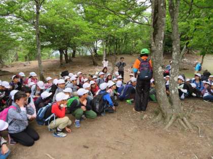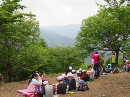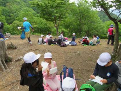 疲れたけれど全員頂上に到着しました。みんな,よく頑張りました!お弁当で疲れを回復。次は三本杉を目指します。
