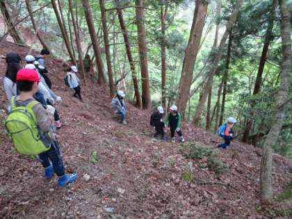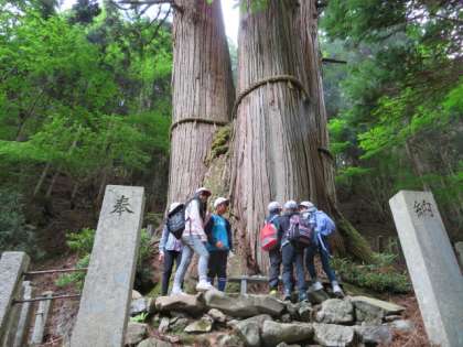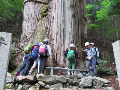 山を下り,ゴール付近の三本杉に到着しました。神様が宿った御神木ということで、みんな願い事をしたり,パワーをもらったりしました。そして,全員しっかりゴールすることができました!