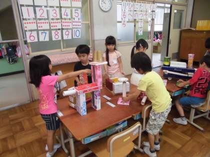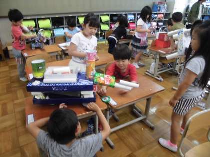 たくさんの箱を使って,動物や車など,思い思いの好きな物を作りました。「ろばができたよ」「新幹線ができたよ」と,子供たちはとても嬉しそうに話していました。この活動を通して,箱の特徴について学習していきます。