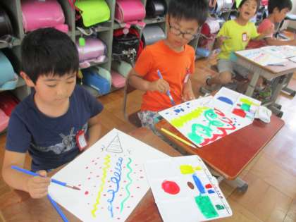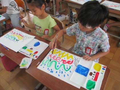 図工で絵具の使い方の学習をしています。今日はいろいろな線を書く練習をしました。筆を上手に使って楽しい絵が仕上がりました。