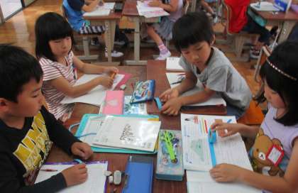 算数で「長さ」の学習をしています。10センチメートルの予想を立ててテープを切ってみてから、実際にものさしを使って10センチメートルを測って比べました。