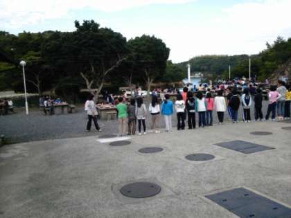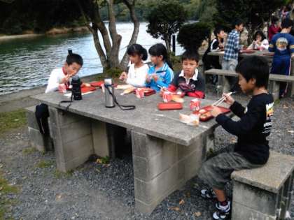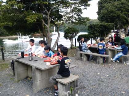 午前8時から野外炊事場で朝食をいただきました。その横を漁船が通っています。