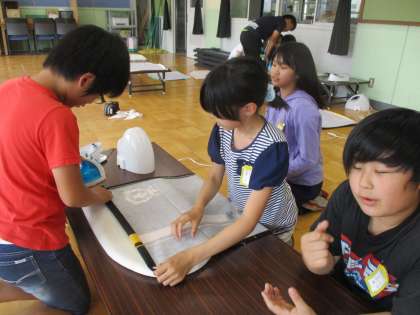 エプロンを縫う前に三つ折りをして、アイロンがけをしました。初めてのアイロンでも、上手に使っていました。