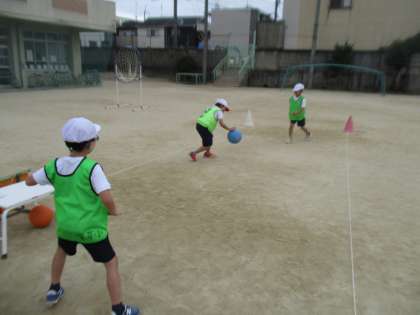 マットあそびの次は、パスゲームです。ただ単にパスをするだけではなく、ゴールまで味方と力を合わせてボールを運ぶことに難しさと戸惑いがありました。しかし、「ボールを持っていない味方が動いてパスをもらう!」と気づくことができました。もうすぐねらい2も始まり、さらにレベルアップしていきます!
