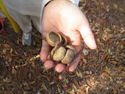 散策しながら松ぼっくりやどんぐりを集めています。大きさが違ったり、形が違ったり・・・。手に取って何度も確かめていました。