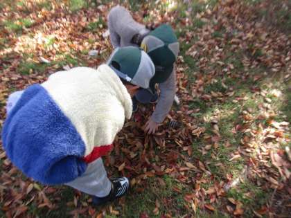 「大きい松ぼっくりやなぁ!!!」「シークレットどんぐりや!!!」など、自然の中で見つけた特徴を感じ、グループで声を掛け合いながら楽しく活動していました。「この実、ミカンの匂いがするんやって!」「どれー!?」と互いに発見したことを確かめ合う、「学び合いの姿」も素晴らしかったです。